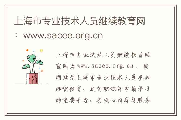 上海市专业技术人员继续教育网官网为 www.sacee.org.cn 。该网站是上海市专业技术人员参加继续教育、进行职称评审前学习的重要平台,其核心内容与服务如下: