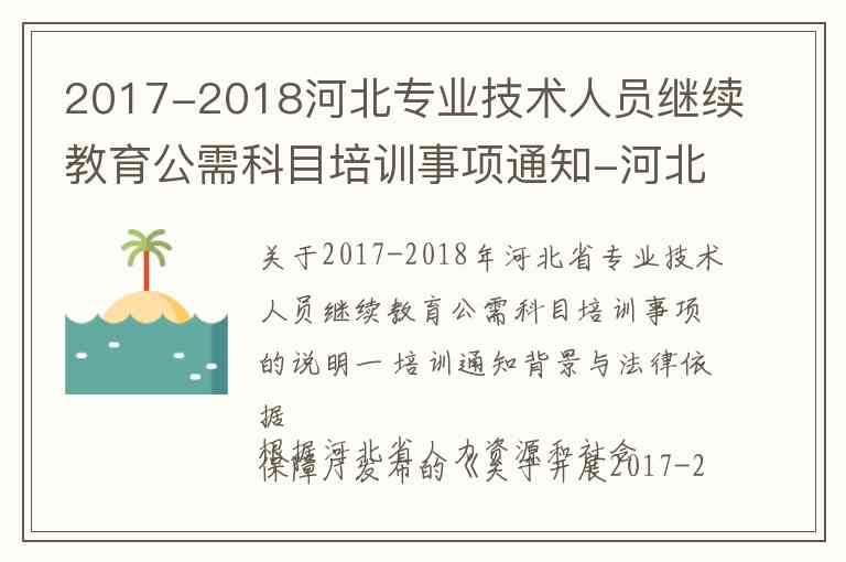 根据河北省人力资源和社会保障厅发布的《关于开展2017-2018年度专业技术人员公需科目继续教育的通知》(冀人社字〔2017〕287号),本次培训是为了落实《河北省专业技术人员继续教育规定》(河北省人民政府令〔2017〕第3号)的相关精神 。该规定自2017年12月1日起施行,明确了专业技术人员继续教育的权利和义务 。