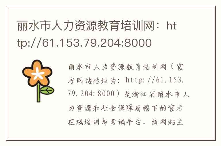 丽水市人力资源教育培训网(官方网站地址为:http://61.153.79.204:8000)是浙江省丽水市人力资源和社会保障局旗下的官方在线培训与考试平台。该网站主要承担全市专业技术人员、事业单位工作人员及企业人才的继续教育、业务培训和考核工作。