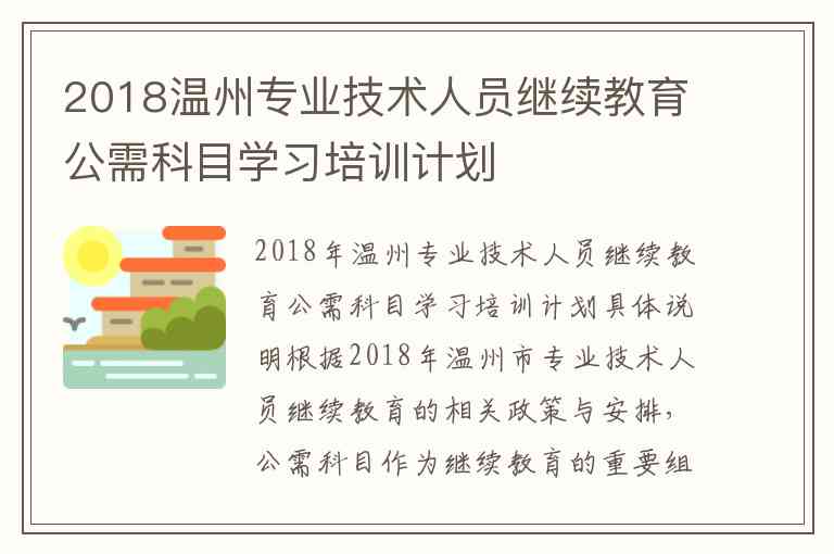 2018年温州市专业技术人员继续教育公需科目的培训计划严格按照《浙江省专业技术人员继续教育学时管理办法(试行)》和《温州市专业技术人员继续教育学时管理实施细则(试行)》执行。继续教育学时作为专业技术人员职称申报、岗位聘用等重要依据,未完成规定学时者将影响职称评审资格。建议专业技术人员及时关注温州继续教育网(www.wzjxjy.cn)发布的最新通知,合理安排学习与考试时间。