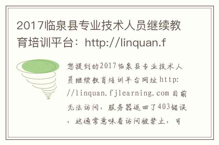 您提到的2017临泉县专业技术人员继续教育培训平台网址 http://linquan.fjlearning.com 目前无法访问,服务器返回了403错误,这通常意味着访问被禁止,可能是该网站已经停止服务、迁移或设置了访问限制。因此,我无法直接为您提供该网站当年的具体内容和服务详情。