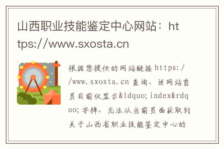 根据您提供的网站链接 https://www.sxosta.cn 查询,该网站首页目前仅显示“index”字样,无法从当前页面获取到关于山西省职业技能鉴定中心的具体内容、服务、地址或联系方式。