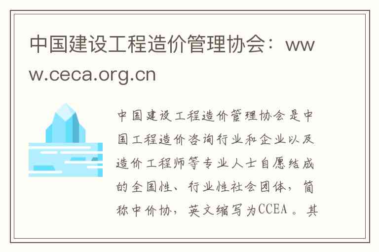 中国建设工程造价管理协会是中国工程造价咨询行业和企业以及造价工程师等专业人士自愿结成的全国性、行业性社会团体,简称中价协,英文缩写为CCEA 。其登记管理机关是民政部,行业管理部门是住房和城乡建设部,会址设在北京 。