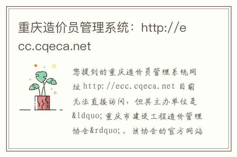 您提到的重庆造价员管理系统网址 http://ecc.cqeca.net 目前无法直接访问,但其主办单位是“重庆市建设工程造价管理协会”。该协会的官方网站为 http://www.cqeca.org/ ,是重庆造价行业的核心管理与服务机构。以下为您整理了该协会的具体内容、服务及联系方式。