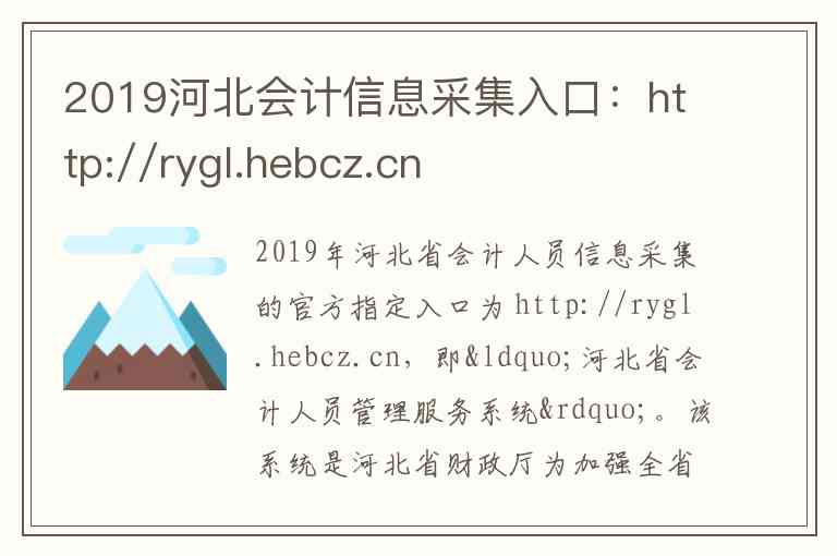 2019年河北省会计人员信息采集的官方指定入口为 http://rygl.hebcz.cn,即“河北省会计人员管理服务系统”。该系统是河北省财政厅为加强全省会计人员管理而建立的一站式服务平台,核心功能是完成会计人员的信息采集,这也是后续参加继续教育、资格考试报名、办理档案调转等事项的必要前置步骤。