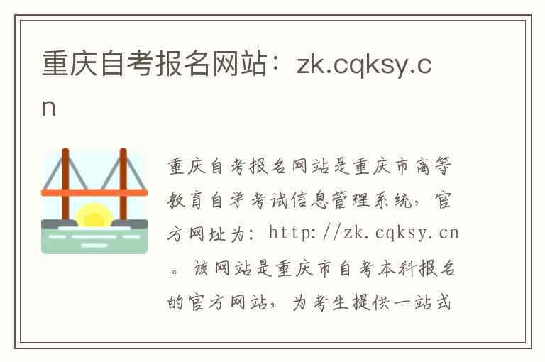 重庆自考报名网站是重庆市高等教育自学考试信息管理系统,官方网址为:http://zk.cqksy.cn 。该网站是重庆市自考本科报名的官方网站,为考生提供一站式的自考服务 。