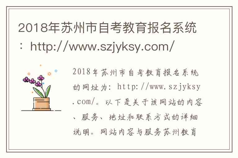 2018年苏州市自考教育报名系统的网址为:http://www.szjyksy.com/。以下是关于该网站的内容、服务、地址和联系方式的详细说明。