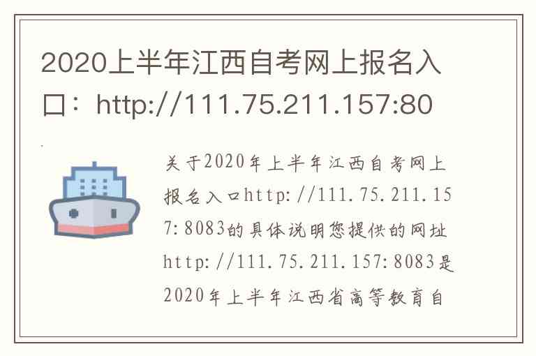 您提供的网址http://111.75.211.157:8083是2020年上半年江西省高等教育自学考试的网上报名入口。需要特别说明的是,该入口是一个IP地址,通常用于直接访问报名系统。但根据多个教育资讯网站和自考服务平台的信息,更通用、更官方的报名途径是通过江西省教育考试院的官方网站进入。以下将结合该官方平台,为您详细说明报名入口提供的核心内容与服务,并提供相关的地址和联系方式。
