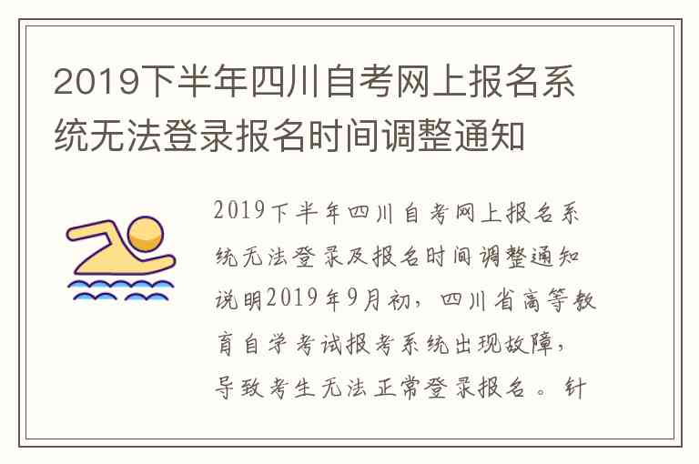 2019年9月初,四川省高等教育自学考试报考系统出现故障,导致考生无法正常登录报名 。针对这一情况,四川省教育考试院发布了相关通知,对报名时间进行了调整,并说明了相关安排。具体内容及服务如下