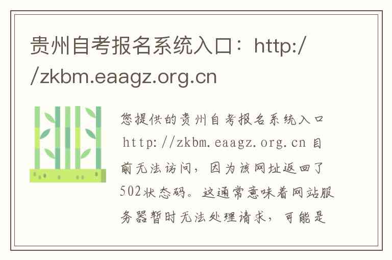 您提供的贵州自考报名系统入口 http://zkbm.eaagz.org.cn 目前无法访问,因为该网址返回了502状态码。这通常意味着网站服务器暂时无法处理请求,可能是由于维护、访问量过大或技术故障导致的。根据贵州省招生考试院的最新官方通告,贵州省高等教育自学考试的报名入口已发生变更,目前主要通过“贵州自考”微信小程序进行。