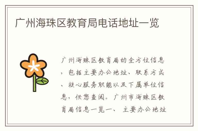 广州海珠区教育局的全方位信息,包括主要办公地址、联系方式、核心服务职能以及下属单位信息,供您查阅。