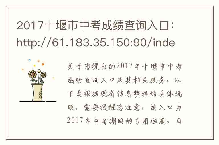 关于您提出的2017年十堰市中考成绩查询入口及其相关服务,以下是根据现有信息整理的具体说明。需要提醒您注意,该入口为2017年中考期间的专用通道,目前可能已经无法使用,以下信息仅供您回顾参考。