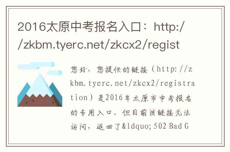 您好,您提供的链接(http://zkbm.tyerc.net/zkcx2/registration)是2016年太原市中考报名的专用入口。但目前该链接无法访问,返回了“502 Bad Gateway”状态码。这通常意味着对应的服务器在当时(2016年)未能正常工作,或者在多年后的今天,这个临时的报名专用链接早已被关闭和停用。