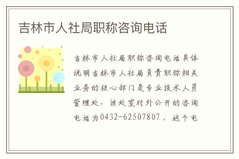 吉林市人社局负责职称相关业务的核心部门是专业技术人员管理处,该处室对外公开的咨询电话为0432-62507807 。这个电话是处理全市职称相关问题的主要联系渠道。