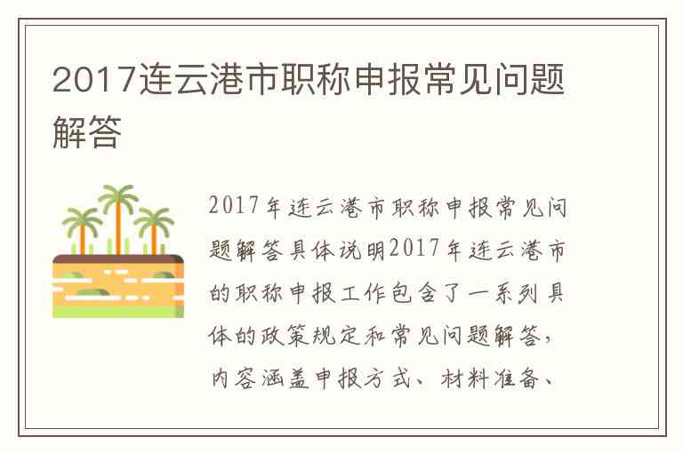 2017年连云港市的职称申报工作包含了一系列具体的政策规定和常见问题解答,内容涵盖申报方式、材料准备、受理机构等多个方面。具体说明如下: