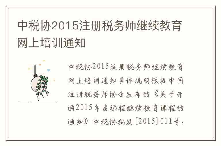 根据中国注册税务师协会发布的《关于开通2015年度远程继续教育课程的通知》中税协秘发[2015]011号,现将2015年度注册税务师继续教育网上培训的具体内容与服务说明如下