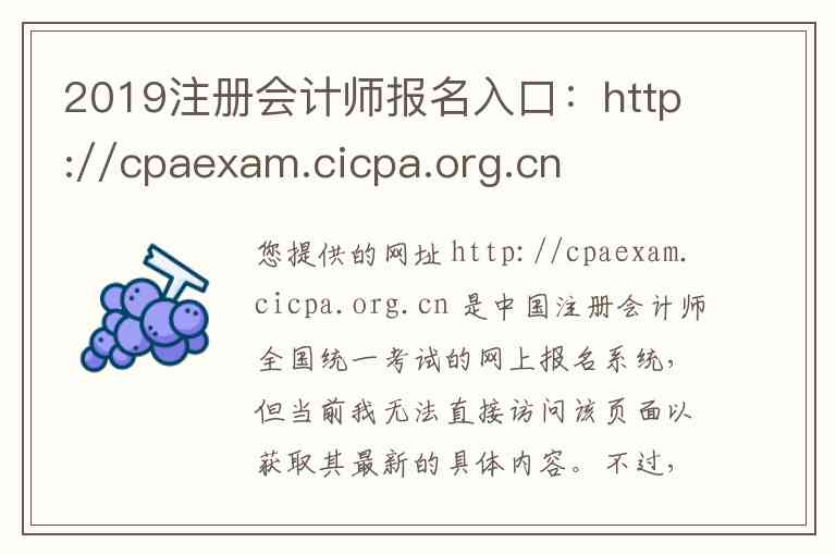 您提供的网址 http://cpaexam.cicpa.org.cn 是中国注册会计师全国统一考试的网上报名系统,但当前我无法直接访问该页面以获取其最新的具体内容。