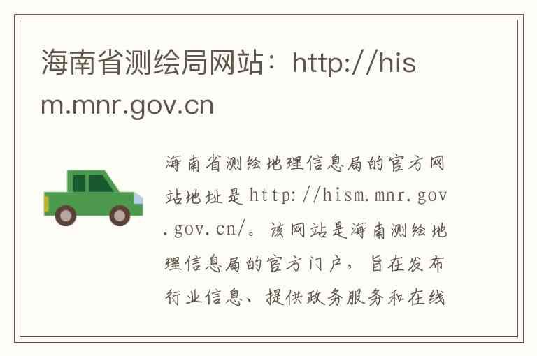 海南省测绘地理信息局的官方网站地址是 http://hism.mnr.gov.gov.cn/。该网站是海南测绘地理信息局的官方门户,旨在发布行业信息、提供政务服务和在线办事功能。以下是根据网站内容和相关信息整理的详细说明。