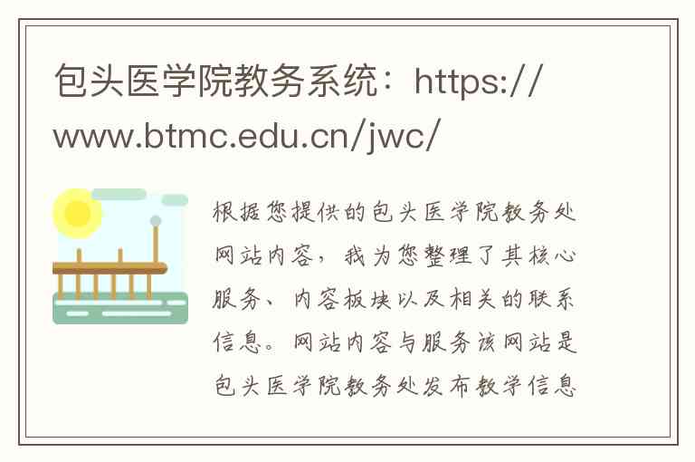 根据您提供的包头医学院教务处网站内容,我为您整理了其核心服务、内容板块以及相关的联系信息。