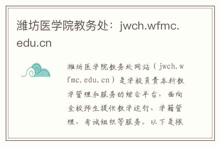 潍坊医学院教务处网站(jwch.wfmc.edu.cn)是学校负责本科教学管理和服务的综合平台,面向全校师生提供教学运行、学籍管理、考试组织等服务。以下是根据官方网站及相关资料整理的详细说明。