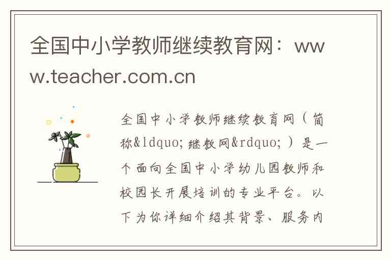 全国中小学教师继续教育网(简称“继教网”)是一个面向全国中小学幼儿园教师和校园长开展培训的专业平台。以下为你详细介绍其背景、服务内容、联系方式等信息。