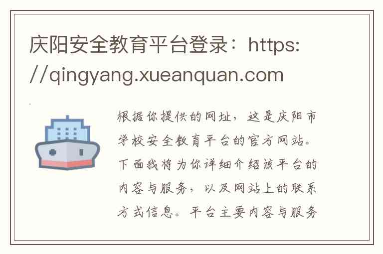 根据你提供的网址,这是庆阳市学校安全教育平台的官方网站。下面我将为你详细介绍该平台的内容与服务,以及网站上的联系方式信息。