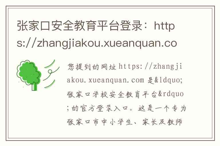 您提到的网址 https://zhangjiakou.xueanquan.com 是“张家口学校安全教育平台”的官方登录入口。这是一个专为张家口市中小学生、家长及教师设计的在线安全教育系统,旨在通过信息化手段提升学生的安全素养。以下为您详细介绍其内容、服务、登录方式及官方联系方式。