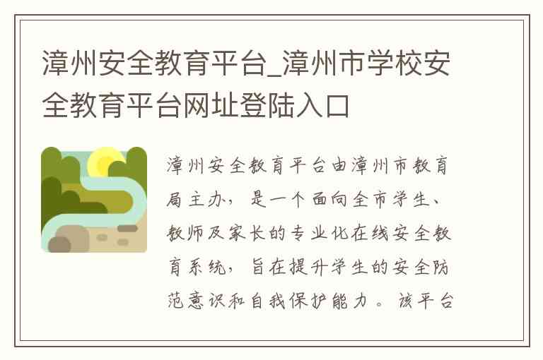 漳州安全教育平台由漳州市教育局主办,是一个面向全市学生、教师及家长的专业化在线安全教育系统,旨在提升学生的安全防范意识和自我保护能力 。该平台覆盖了从幼儿园到中小学的广泛学生群体,通过信息化手段实现安全教育的系统化与规范化 。