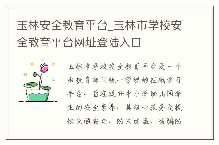 玉林市学校安全教育平台是一个由教育部门统一管理的在线学习平台,旨在提升中小学幼儿园学生的安全素养,其核心服务是提供交通安全、防火防盗、防骗防欺凌等安全教育的在线课程与作业。以下为您详细说明其登录入口、内容服务及相关参考信息。