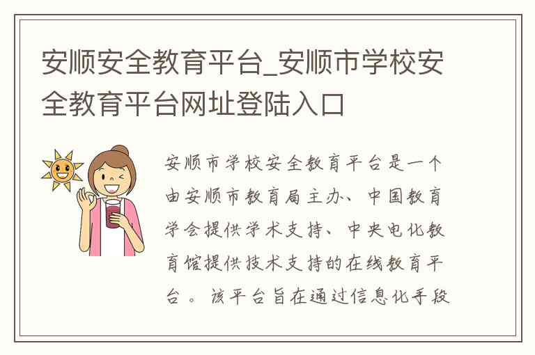 安顺市学校安全教育平台是一个由安顺市教育局主办、中国教育学会提供学术支持、中央电化教育馆提供技术支持的在线教育平台 。该平台旨在通过信息化手段,建立科学、系统、常态化的安全教育机制,重点提升师生及家长的安全防范意识和自救自护能力,最大限度地预防安全事故的发生 。平台内容涵盖交通、消防、防溺水、防欺凌、自然灾害避险、心理健康等多个专题领域。