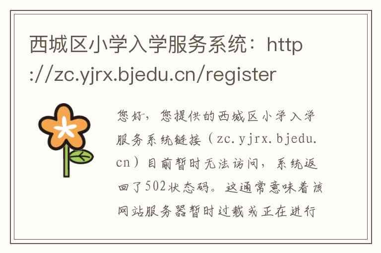 您好,您提供的西城区小学入学服务系统链接(zc.yjrx.bjedu.cn)目前暂时无法访问,系统返回了502状态码。这通常意味着该网站服务器暂时过载或正在进行维护,无法处理您的请求。