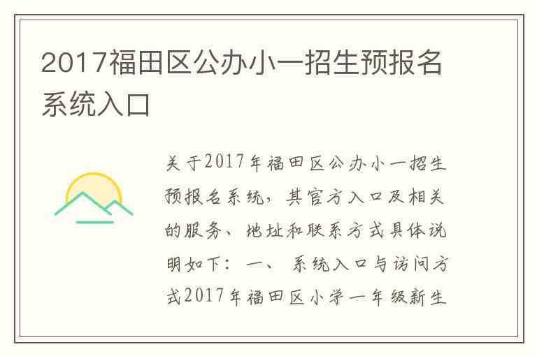 关于2017年福田区公办小一招生预报名系统,其官方入口及相关的服务、地址和联系方式具体说明如下: