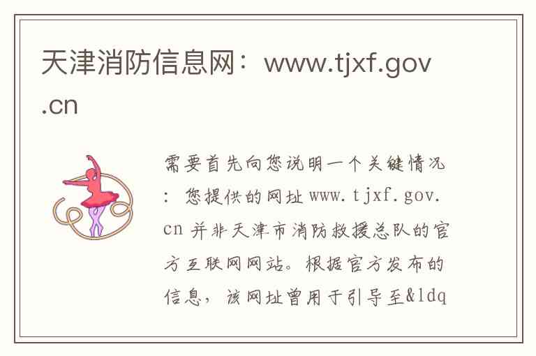 需要首先向您说明一个关键情况:您提供的网址 www.tjxf.gov.cn 并非天津市消防救援总队的官方互联网网站。根据官方发布的信息,该网址曾用于引导至“户籍化管理系统”,但其运营主体与官方无关。天津市消防救援总队的唯一官方网站已于2020年6月30日正式开通上线,网址为 http://tjxf.tj.gov.cn/ 。