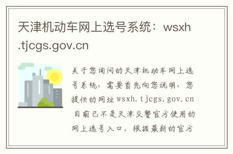 关于您询问的天津机动车网上选号系统,需要首先向您说明,您提供的网址 wsxh.tjcgs.gov.cn 目前已不是天津交警官方使用的网上选号入口。根据最新的官方信息,天津市的机动车网上选号服务已整合至全国统一的“交通安全综合服务平台” 。
