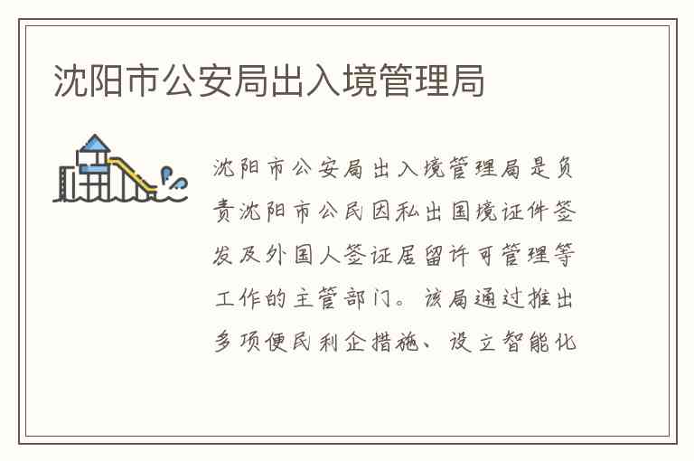 沈阳市公安局出入境管理局是负责沈阳市公民因私出国境证件签发及外国人签证居留许可管理等工作的主管部门。该局通过推出多项便民利企措施、设立智能化服务大厅以及提供一站式移民服务,致力于为市民、企业及外籍人士提供高效便捷的服务。