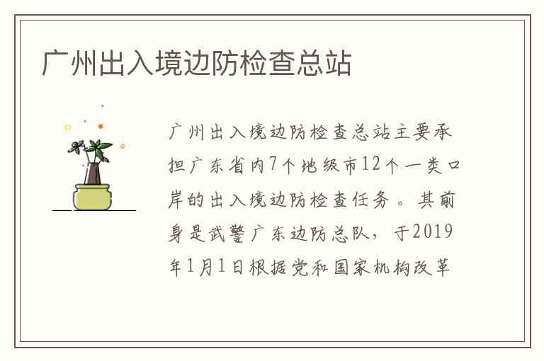广州出入境边防检查总站主要承担广东省内7个地级市12个一类口岸的出入境边防检查任务 。其前身是武警广东边防总队,于2019年1月1日根据党和国家机构改革统一部署转隶组建 。