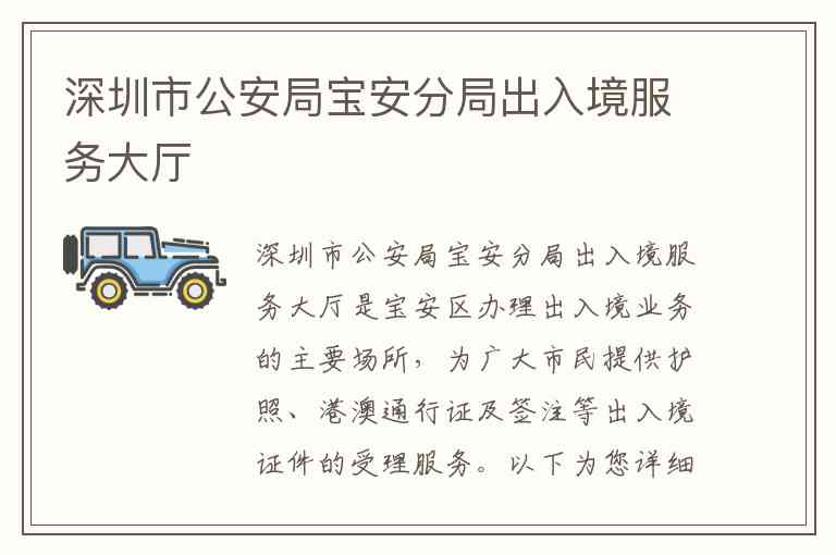深圳市公安局宝安分局出入境服务大厅是宝安区办理出入境业务的主要场所,为广大市民提供护照、港澳通行证及签注等出入境证件的受理服务。以下为您详细介绍其服务内容、地址及联系方式。