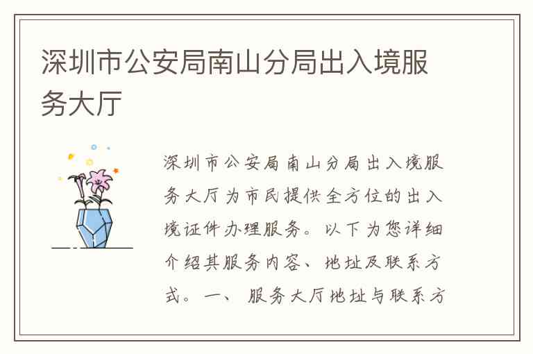 深圳市公安局南山分局出入境服务大厅为市民提供全方位的出入境证件办理服务。以下为您详细介绍其服务内容、地址及联系方式。