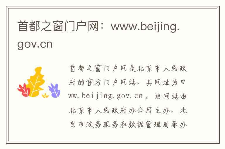 首都之窗门户网是北京市人民政府的官方门户网站,其网址为 www.beijing.gov.cn 。该网站由北京市人民政府办公厅主办,北京市政务服务和数据管理局承办,并由首都之窗运行管理中心负责具体的运行管理工作 。它于1998年7月1日正式开通,作为北京市电子政务建设的关键部分,是市政府面向社会提供服务的重要窗口,也是北京市各部门和各区政府在互联网上发布政府信息、提供在线服务的综合性平台 。