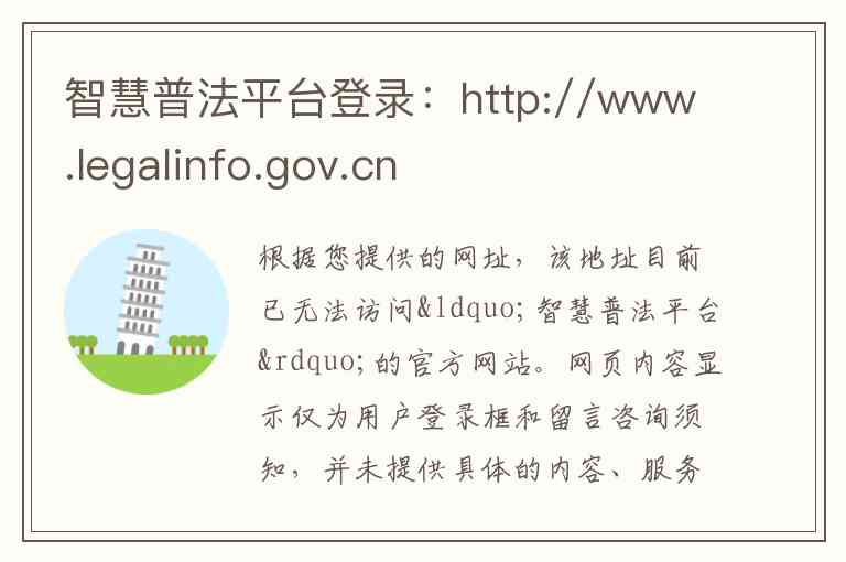 官方网站: 通过司法部官网的公告信息可以确认,该平台的官方域名为 http://legalinfo.moj.gov.cn/ 。您提供的 http://www.legalinfo.gov.cn 可能是其早期使用的旧网址。