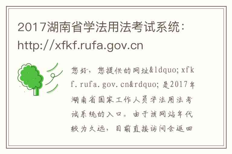 您好,您提供的网址“xfkf.rufa.gov.cn”是2017年湖南省国家工作人员学法用法考试系统的入口。由于该网站年代较为久远,目前直接访问会返回“502”错误,意味着该网站现在已经无法正常打开。不过,根据当时的公开信息,这个系统有着明确的用途和服务内容。