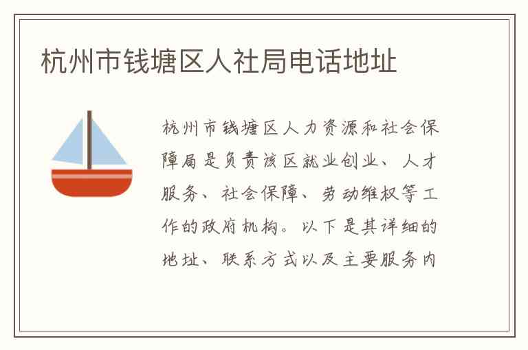 杭州市钱塘区人力资源和社会保障局是负责该区就业创业、人才服务、社会保障、劳动维权等工作的政府机构。以下是其详细的地址、联系方式以及主要服务内容的纯文字说明。