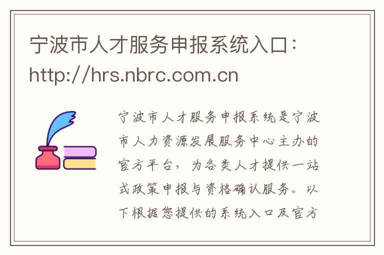 宁波市人才服务申报系统是宁波市人力资源发展服务中心主办的官方平台,为各类人才提供一站式政策申报与资格确认服务。以下根据您提供的系统入口及官方信息,为您详细介绍其内容、服务、地址及联系方式。