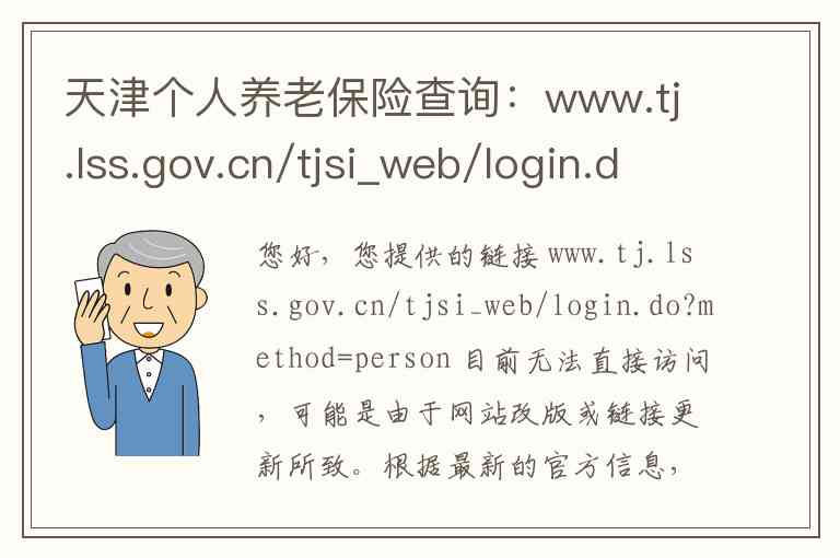 您好,您提供的链接 www.tj.lss.gov.cn/tjsi_web/login.do?method=person 目前无法直接访问,可能是由于网站改版或链接更新所致。根据最新的官方信息,天津市个人养老保险查询等服务已整合至新的官方平台。