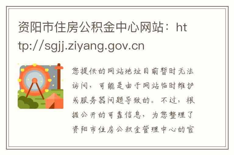 您提供的网站地址目前暂时无法访问,可能是由于网站临时维护或服务器问题导致的。不过,根据公开的可靠信息,为您整理了资阳市住房公积金管理中心的官方线上平台、核心服务、线下网点地址和联系方式,供您参考。