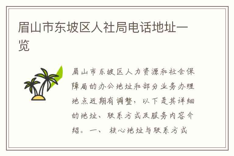 眉山市东坡区人力资源和社会保障局的办公地址和部分业务办理地点近期有调整,以下是其详细的地址、联系方式及服务内容介绍。