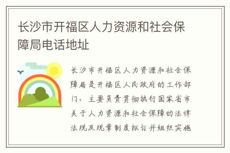长沙市开福区人力资源和社会保障局是开福区人民政府的工作部门,主要负责贯彻执行国家省市关于人力资源和社会保障的法律法规及规章制度拟订并组织实施全区人力资源和社会保障事业发展规划。