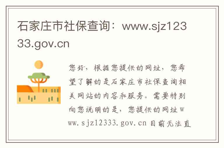 您好,根据您提供的网址,您希望了解的是石家庄市社保查询相关网站的内容和服务。需要特别向您说明的是,您提供的网址 www.sjz12333.gov.cn 目前无法直接打开访问。