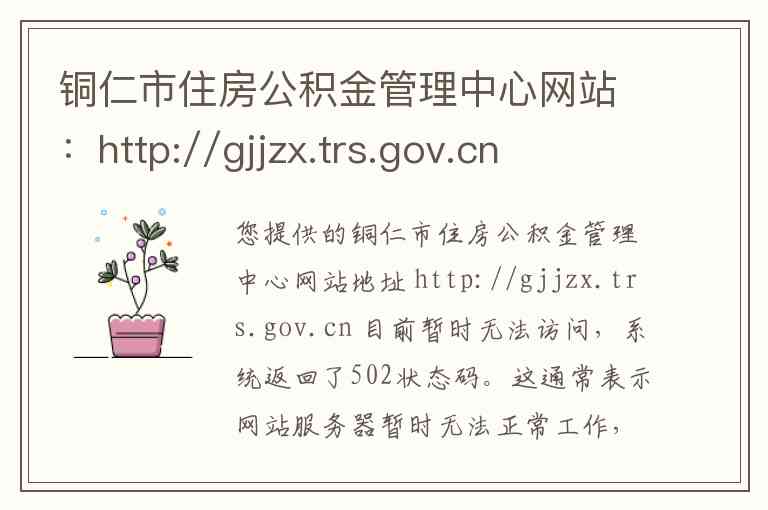 您提供的铜仁市住房公积金管理中心网站地址 http://gjjzx.trs.gov.cn 目前暂时无法访问,系统返回了502状态码。这通常表示网站服务器暂时无法正常工作,可能是由于维护、网络问题或访问量过大导致的临时故障,建议您可以稍后再尝试访问。