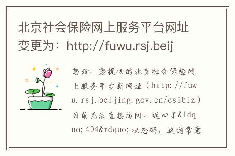 您好,您提供的北京社会保险网上服务平台新网址(http://fuwu.rsj.beijing.gov.cn/csibiz)目前无法直接访问,返回了“404”状态码。这通常意味着该网页地址已失效、已被平台整合或迁移。根据北京市人力资源和社会保障局及官方媒体发布的最新信息,北京市社会保险网上服务平台已全新升级,现将核实后的准确平台入口、服务内容及联系方式为您详细说明。